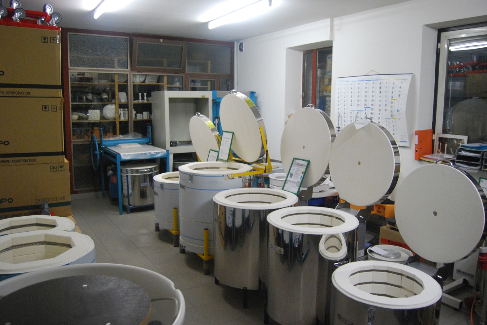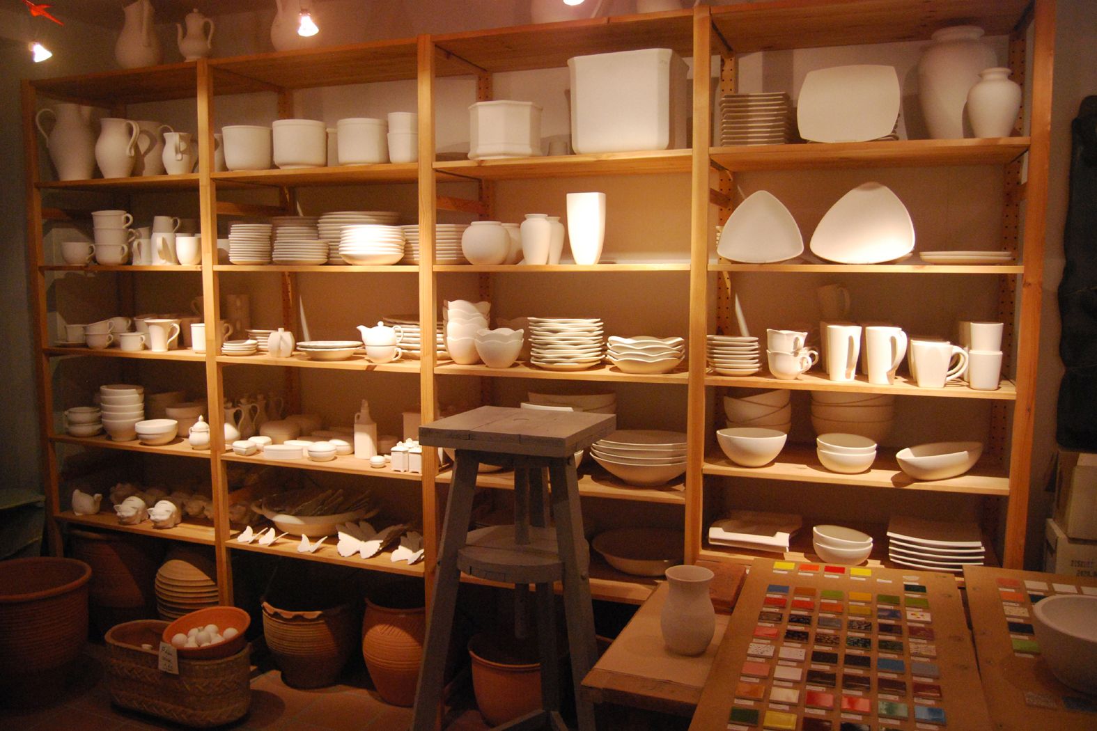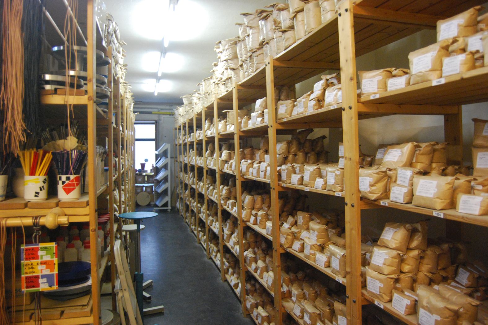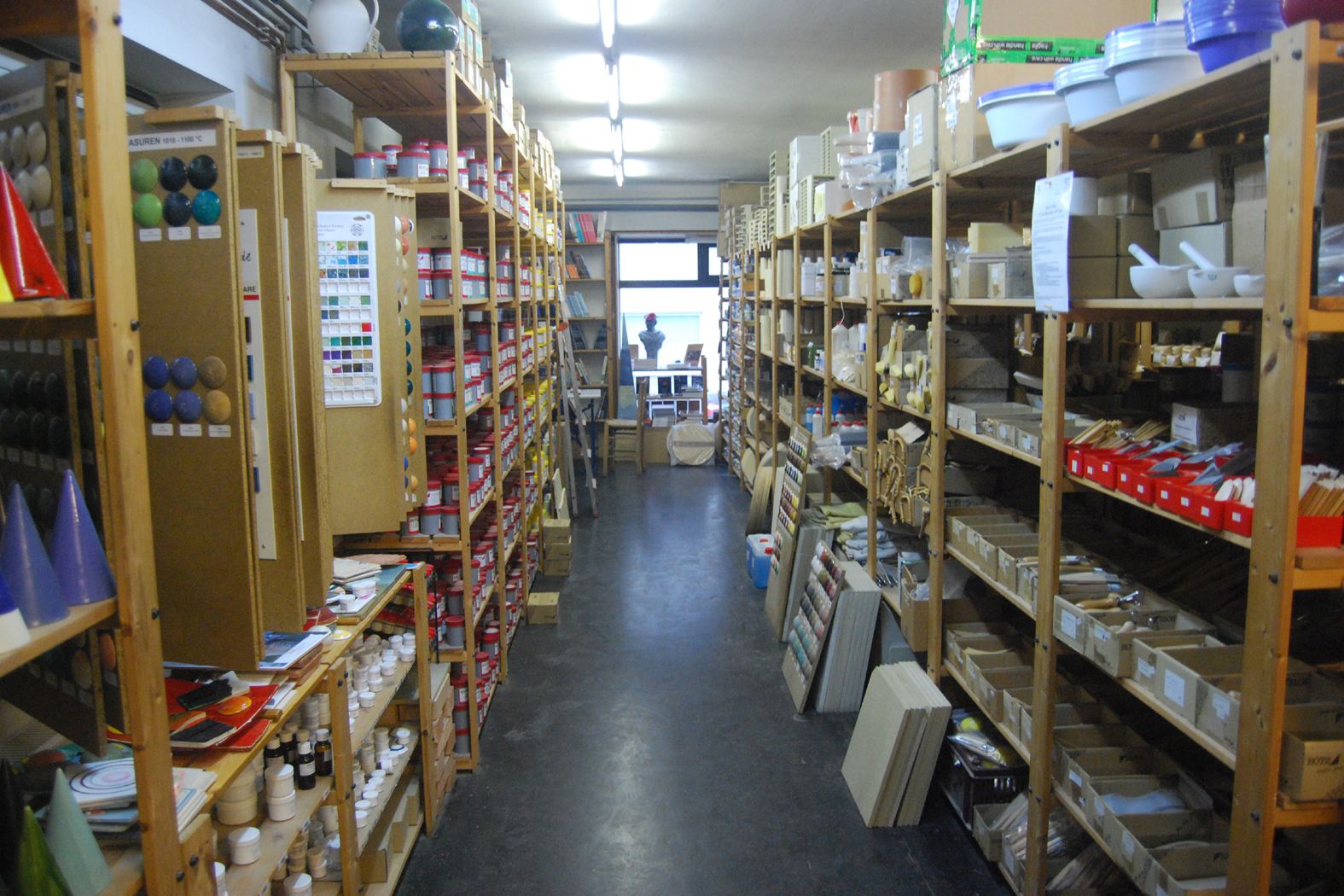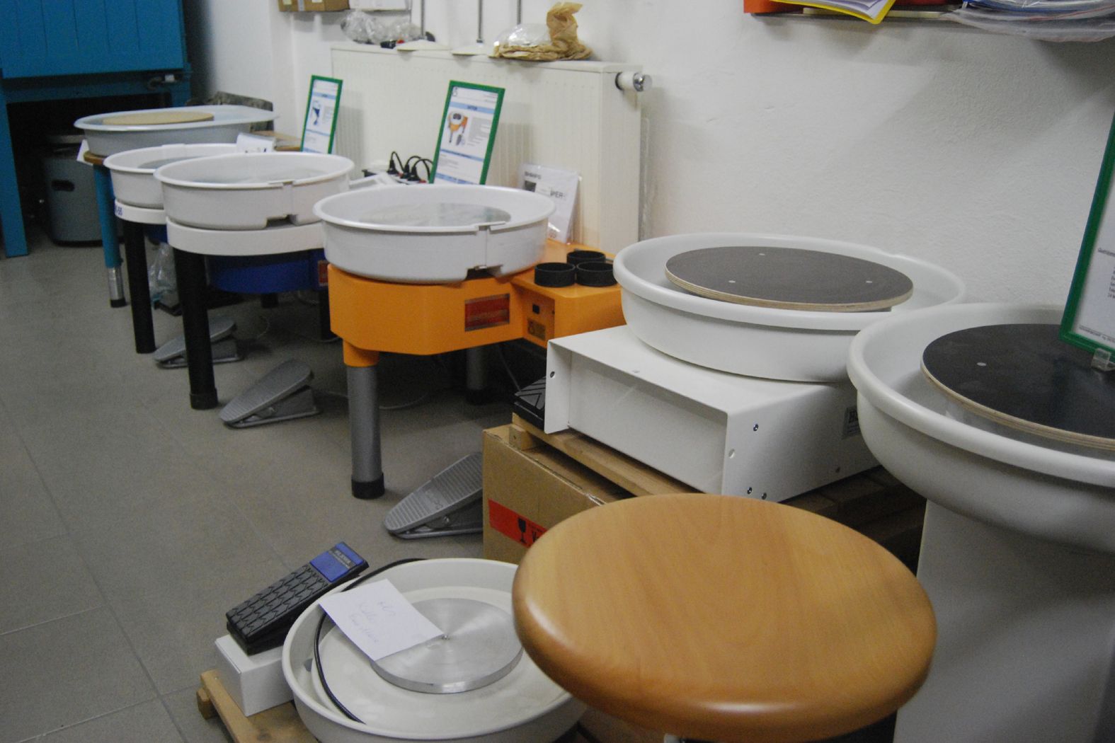 Tone, Glasuren und Töpferscheiben sowie Brennöfen, Gießformen und Rohkeramik.